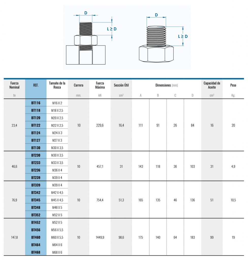 Los tensores para pernos comprenden un rango de pernos desde M16 hasta M68, con la posibilidad de diseños personalizados bajo demanda, para necesidades de características especiales.